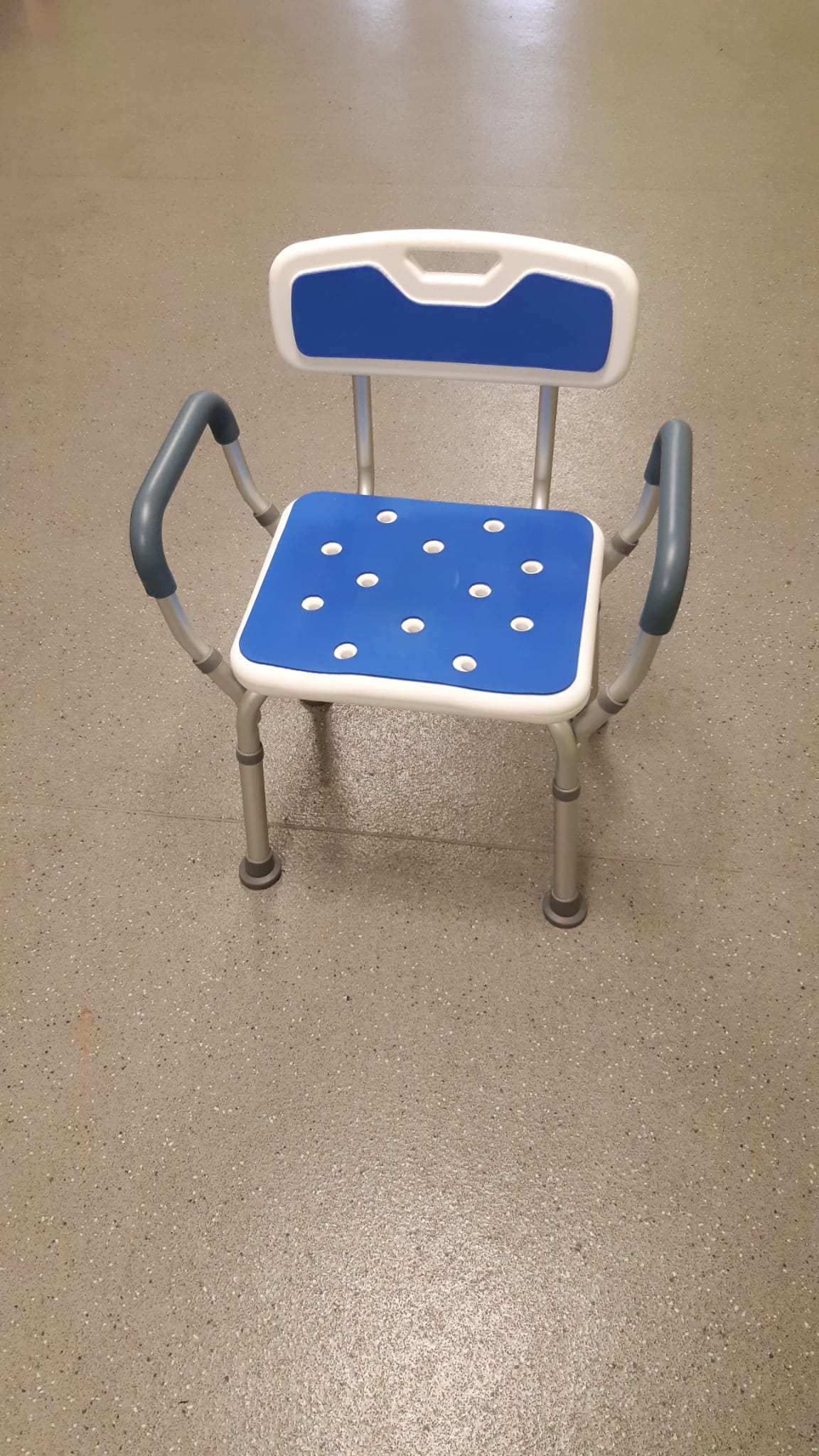 Chair for the shower. The metal chair features a blue foam seat cover on the plastic seat and the backrest, with foam wrapped armrests and four adjustable legs.